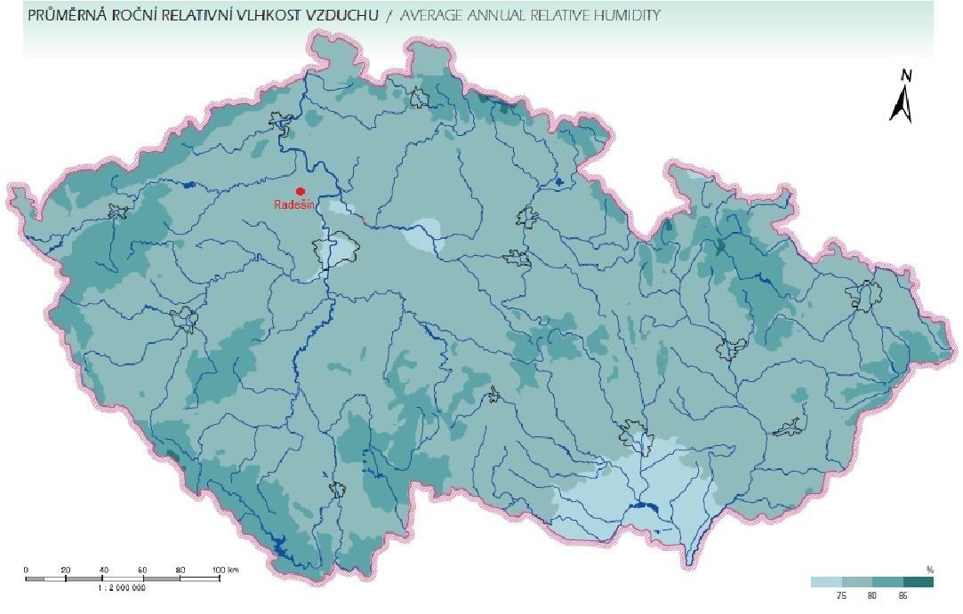 Průměrná roční relativní vlhkost vzduchu v Radešíně je mezi 75% až 80%. Z mapy vyplývá, že jde o průměrnou hodnotu v ČR.